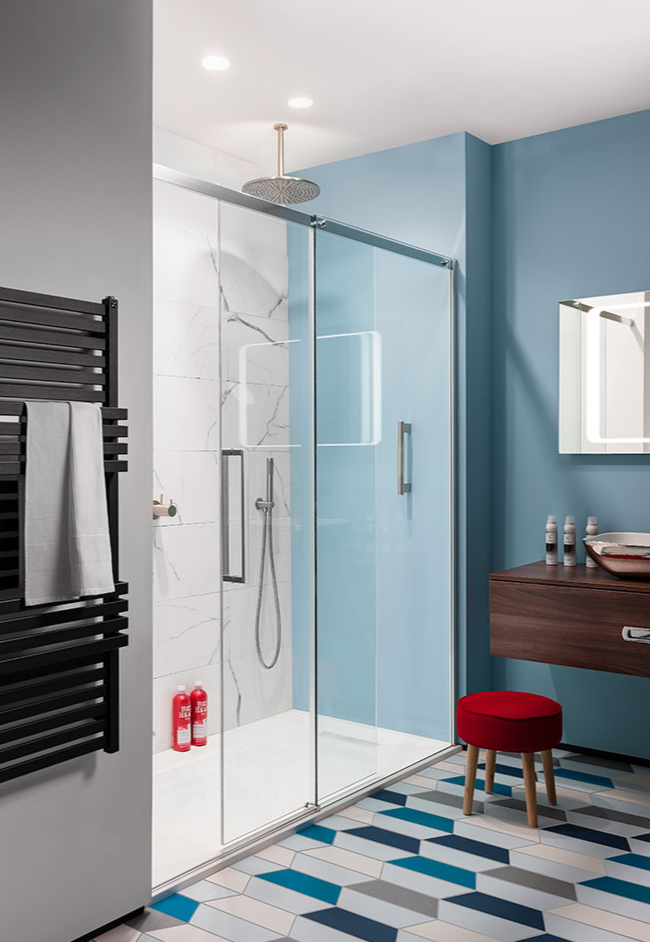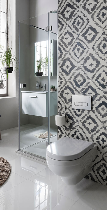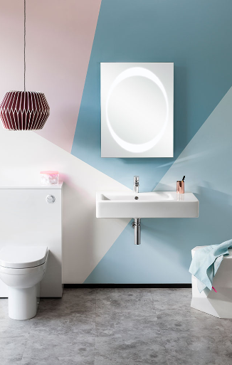 Combine soft pastel tones and graphic angles with gloss white surfaces for a bathroom that exudes on-trend appeal